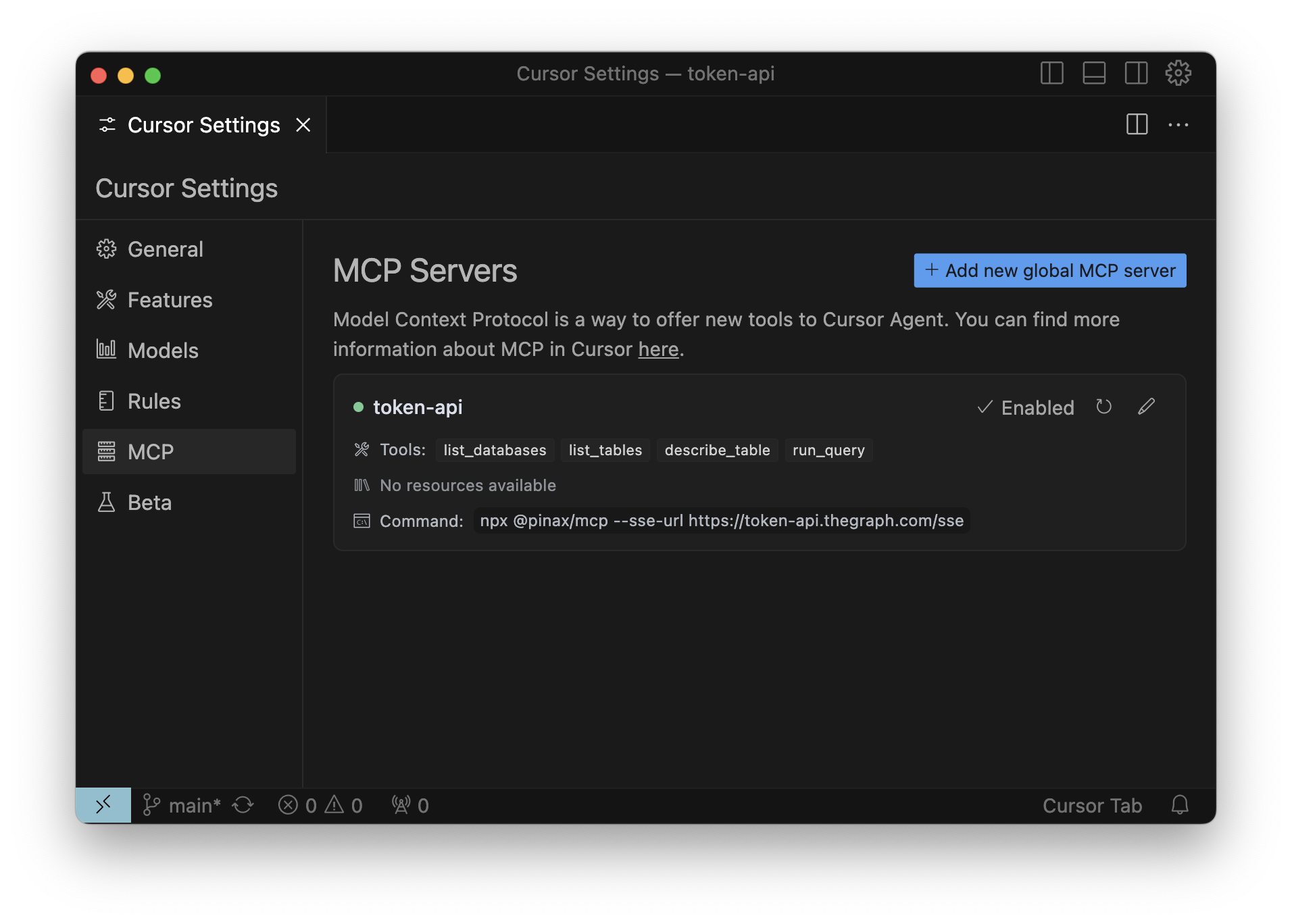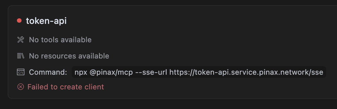 1{2 "mcpServers": {3 "tau-token": {4 "command": "npx",5 "args": ["@pinax/mcp", "--sse-url", "https://token.mcp.tau.org/sse"],6 "env": {7 "ACCESS_TOKEN": "<TAU API Key or JWT>"8 }9 }10 }11}Troubleshooting