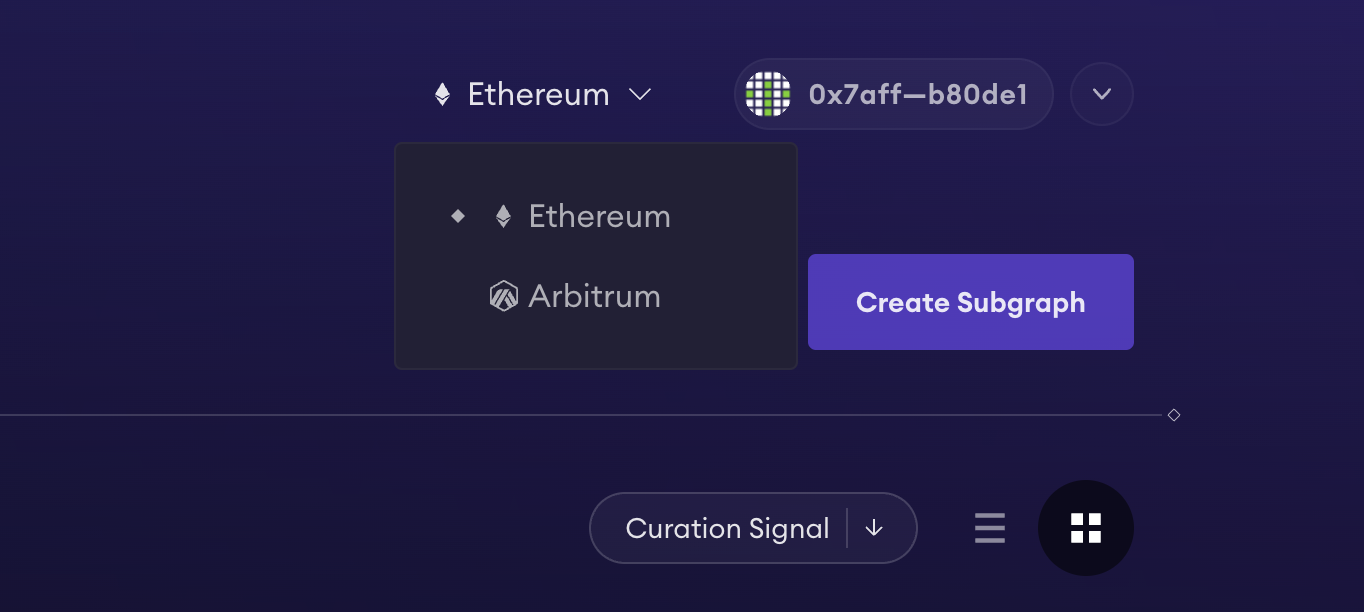 To take advantage of using The Graph on L2, use this dropdown switcher to toggle between chains.