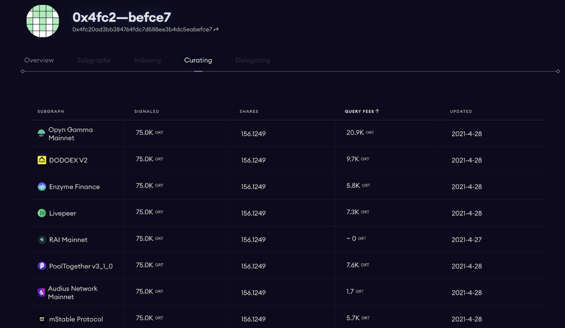 - All the Subgraphs you’re curating on with signal details
