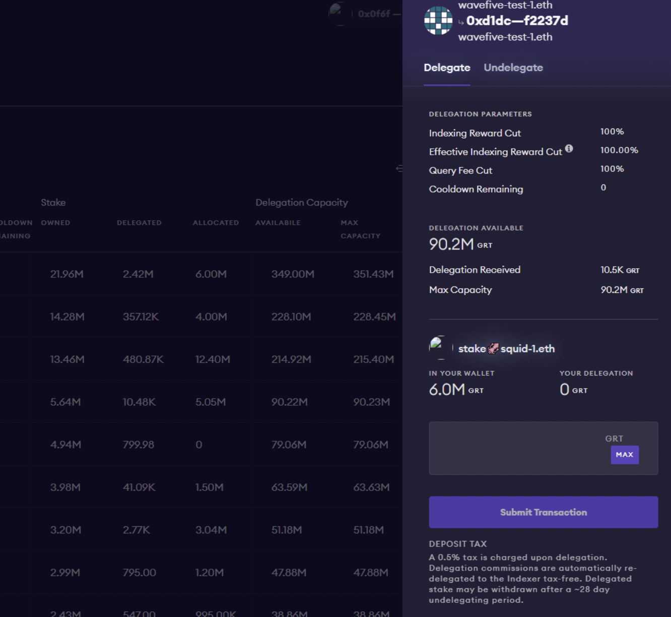- Click “Delegate” next to an Indexer to stake your GRT.