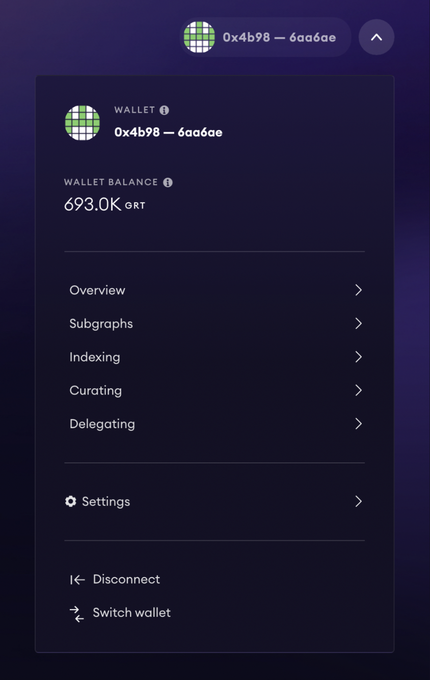 As your official portal into the world of decentralized data, Graph Explorer allows you to take a variety of actions, no matter your role in the network. You can get to your profile settings by opening the dropdown menu next to your address, then clicking on the Settings button.