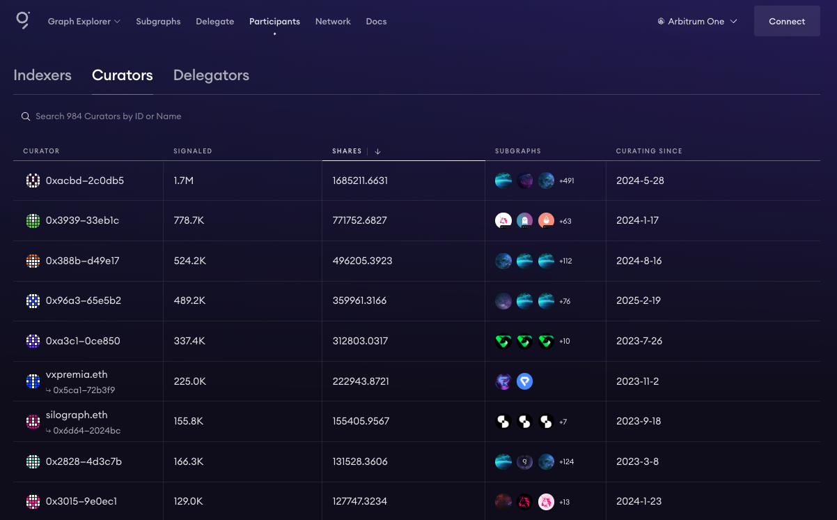 - Curators: signal amounts, Subgraph shares, and activity history