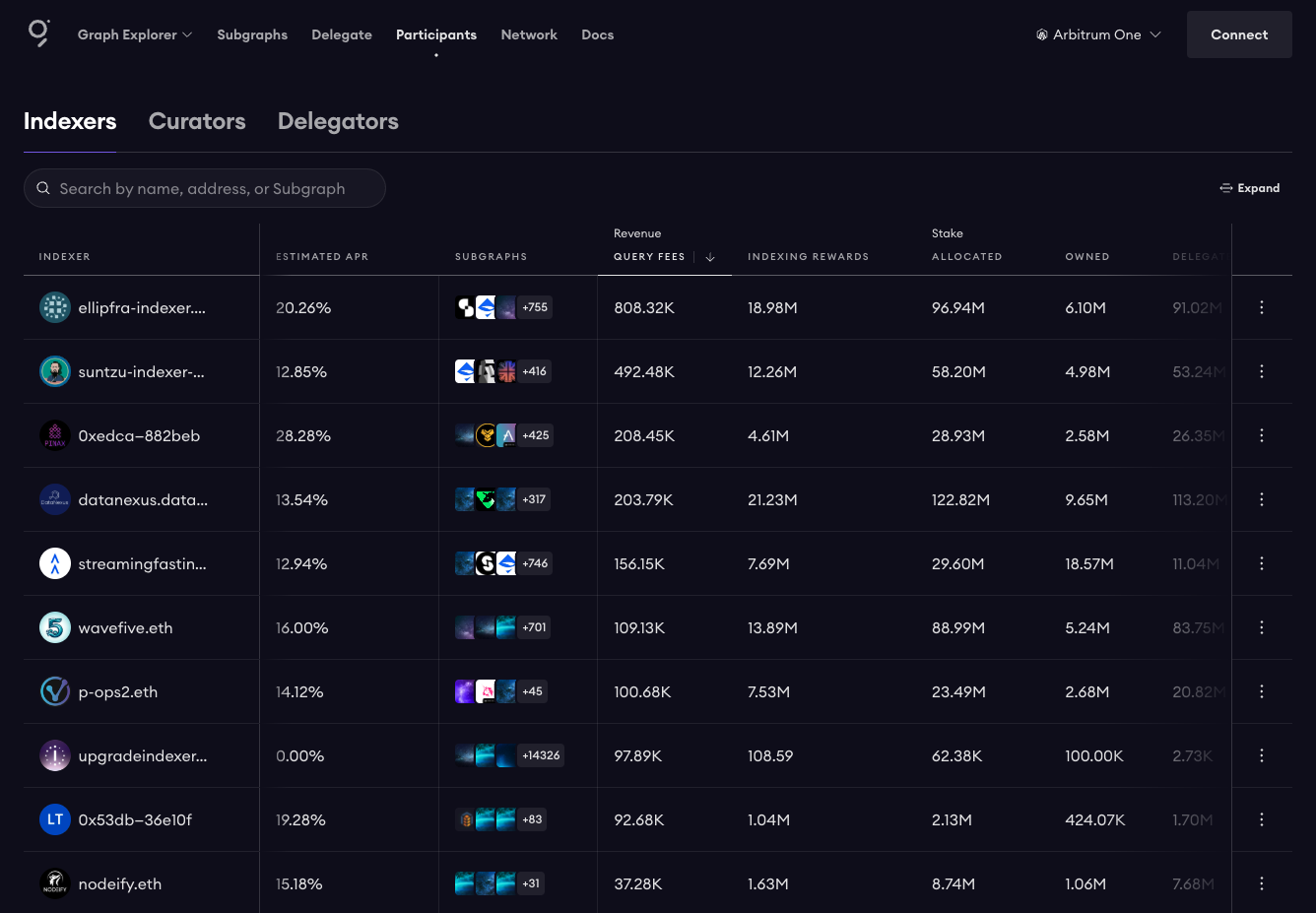 - Compare Indexers by most query fees earned and highest estimated APR.