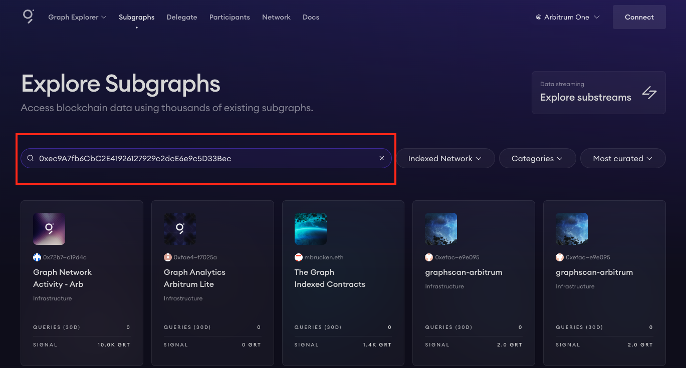To find Subgraphs indexing a specific contract, enter the contract address into the search bar.