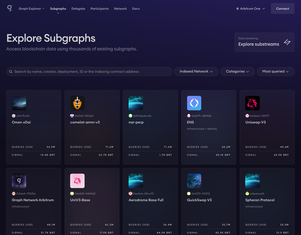 - Search all published Subgraphs and filter them by indexed network, specific categories (such as DeFI, NFTs, and DAOs), and most queried, most curated, recently created, and recently updated.