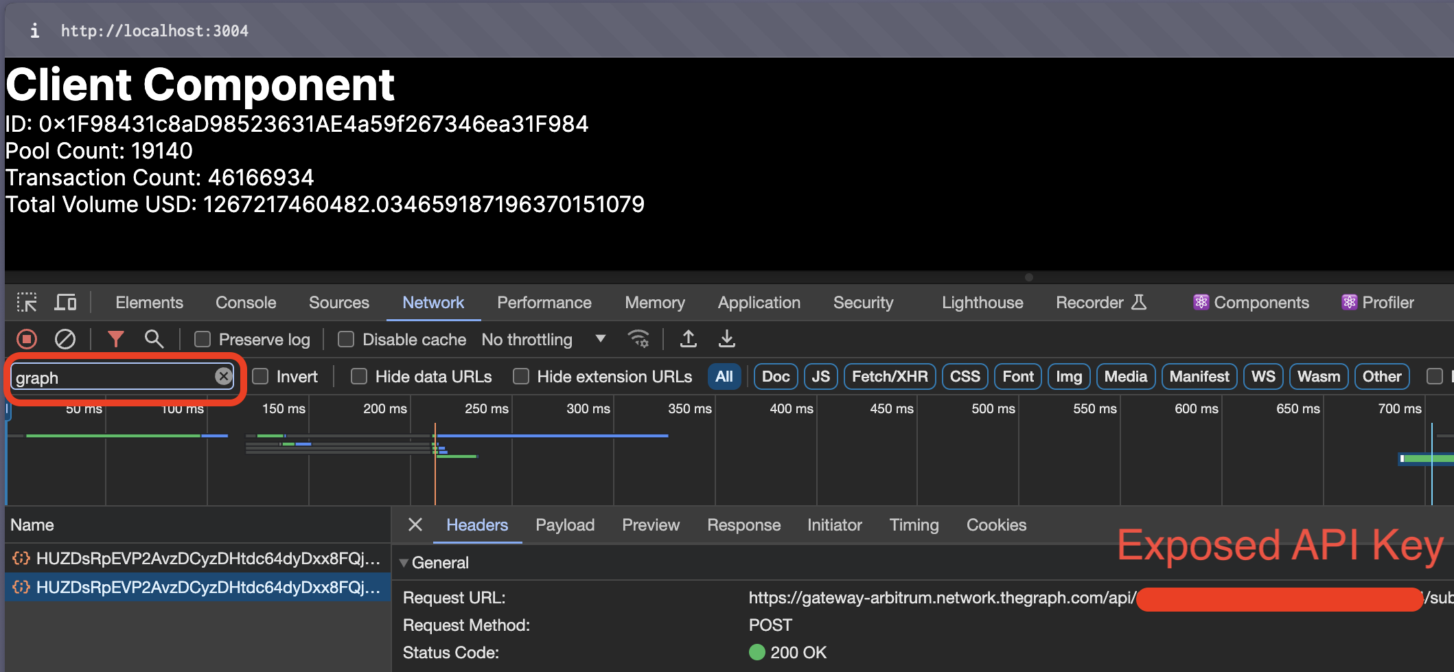 We can use Next.js server components to properly secure our API key from exposure in the frontend of our dapp. To further increase our API key security, we can also restrict our API key to certain Subgraphs or domains in Subgraph Studio.