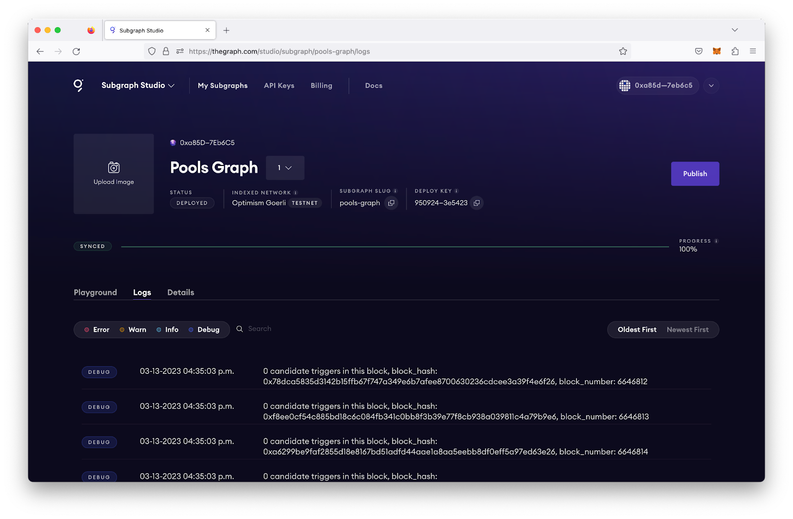 • Check the logs on the dashboard to see if there are any errors with your Subgraph. The logs of an operational Subgraph will look like this: